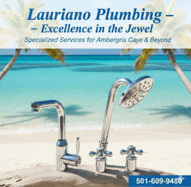 The Master Prompt: Lauriano Plumbing (Ambergris Caye Edition) Visual Description: A high-definition, professional advertisement flyer for Lauriano Plumbing. The background features the stunning, crystal-clear turquoise waters and white sands of Ambergris Caye, Belize. In the foreground, a set of polished, chrome plumbing fixtures gleams under the bright tropical sun, reflecting the "Greatness" of the craft.